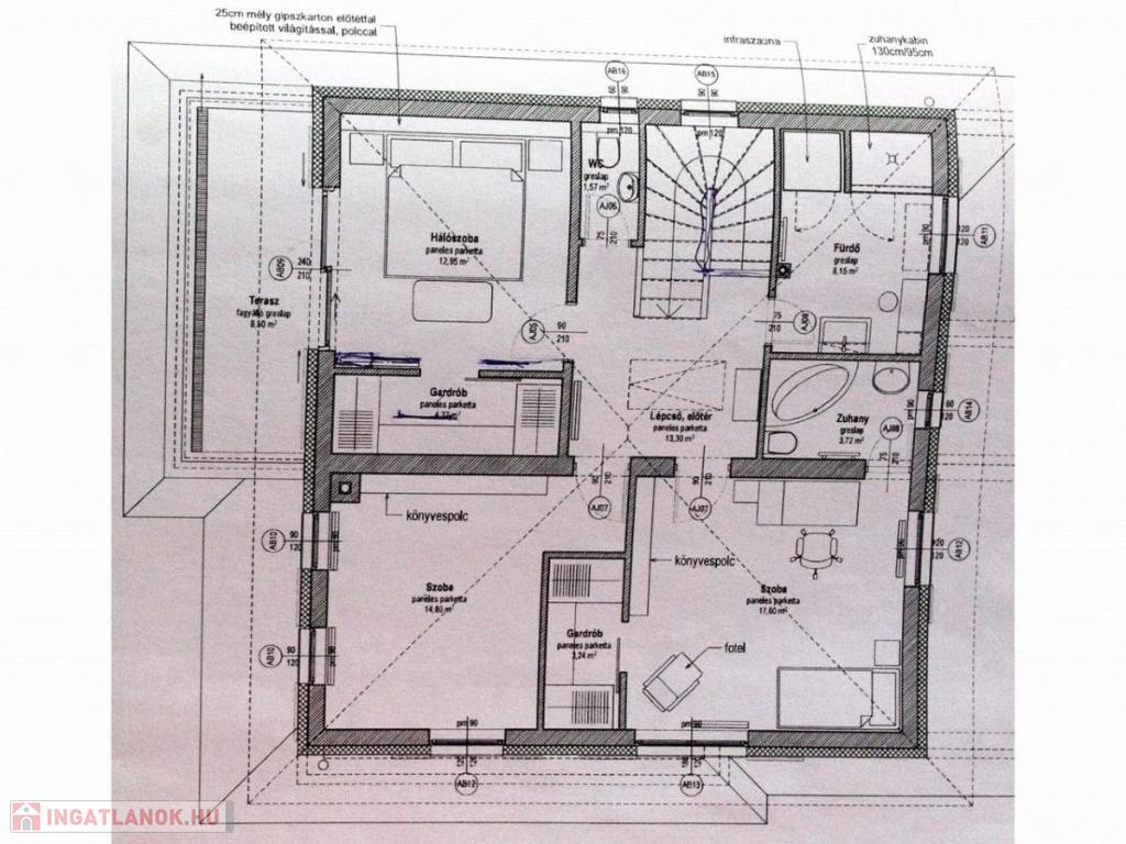 2 fürdőszoba (kádas, zuhanyzós), INFRASZAUNA, külön WC, előtér és terasz (8 nm).